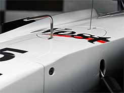 | 展示車のリアエンドまわり。ラジエーターからの廃熱は煙突ダクトにお任せ。 | 2000年のレース車。煙突形状は全く同じ。それに煙突横の見にウイング形状も全く同じ | 今年のレース車。廃熱煙突はないし、上方排気になっているし、タイヤ前のフラップもトレンドのままにあるし、ミニウイングの造形も全く違うって。 |