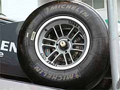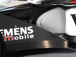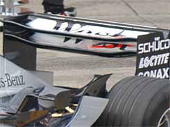 | 展示車のフロントウイング。真ん中がちょっと持ち上がって両サイドが少し下がっているのは、少し前のトレンド | 今年のレースマシン。左のトレンドと全く逆に、両脇が持ち上がった形状である。フラップの配色もSIEMENSの色もぜんぜん違う。 | 展示車のフロントウイング・エンドプレート(翼端版)。いつの間にかこんなところまで翼断面形状になっていたのさ。 |