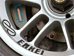 | とりあえずコックピット周り。あとあと色々な比較をするんでよーく見ておくように | ミシュランマークはもうくすんじゃってまあ・・・ENKEIの2本スポーク型ホイールは結構かっこいいぞ | 日本のENKEIだ。ブレーキキャリパーには温度管理シールが貼ってあるのが分かるぞ |