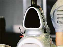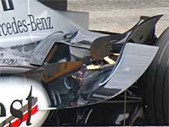 | おととしはマクラーレンもWest(タバコマーク)を隠していたんだなぁ。フェラーリは今でも隠しているけど・・・(マールボロの親玉:フィリップモリスがうるさいんだろうなぁ) | 見ての通りバージボードはまったく異形状である。背が低くて長いバージョン。 | さらにおまけとして1999年のレース車のヘッドレスト周りの造形。整流フィンは上下連結タイプのがしっかりついているが、頭部プロテクタは低く後ろのつながっていないのだ。 |