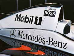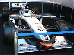 | これは展示車のヘッドレスト部アップ。整流フィンの取り付けは模型の参考になるぞ。また一応ファーストナンバーのクルサードのネームが入っている。勢いならライコネンなんだけどなぁ。 | これも展示車のノーズ先端。展示車ということでノーズ先端には空気取り入れ穴がなくなっている | これは2000年の車。空気取り入れ穴がある。けど形は全く同じである。McLarenのチーム名が入る場所と色が違うね |