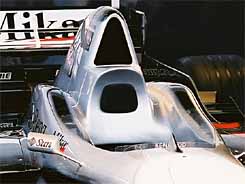 | これは2001年にマクラーレンの展示車としては初めて出現したマシン。上から見ると、どこをとっても古臭く感じてしまう造形なのだ。 | コックピット周辺、ヘッドレスト、インダクションポッド周りがそれを一番感じるあたりだ。 | このようにドライバープロテクトの盛り上げと後部まで引きずるのは、二昔の造形だね。 |