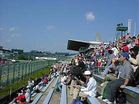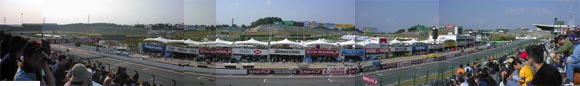 観戦席からの眺めはこんな具合だ(画像を張り合わせたためひずんでいるのは勘弁)。こんなにピットが見えるなんて・・・俺の血は256℃くらいに沸騰しそうだ。座った場所はホームストレートの真中よりちょい後半のところなのであった。スピードも結構でてる。流し撮りをしたいが、座っていて左右に人がいるんで、長いレンズだとちょっと無理。でも所詮400mmもあると流し撮りできないね。追いかけきれない。