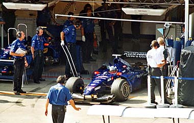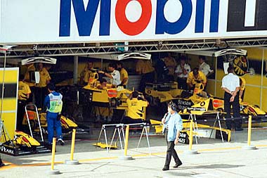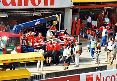 ジョーダンのピットは斜め前。こんなマシンを見れるのは究極の幸せ。おっ、川井ちゃんが歩いて来たぞ。保奈美ちゃんの思い出を忘れるために、仕事に励んでくれ。ちなみに古本屋で川井ちゃんの”ワハハ読本”ちゅー本を100円で買ったのだが、彼は優等生&おぼっちだったらしい。しかし、高校受験に失敗してオーストラリアに留学して、ぺらぺら君になったらしい。何事も失敗が人間を大きくするのだなぁ。