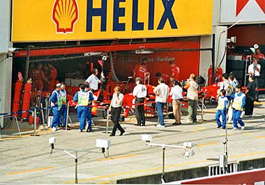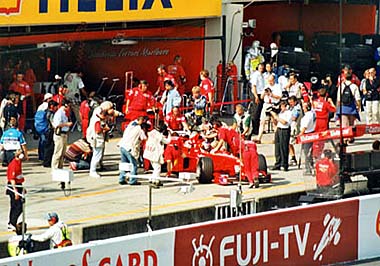 フェラーリのピット前。青い服は鈴鹿のオフィシャルだ。ところがよくよく見ると、地元の高校生にしか見えない。青い服は明らかに“ジャージ“だ。もうちょっとましな服着せればいいのに。しかし、こんなところに出入りできて、かつお金もらえるなんて、なんてうらやましいんだ >鈴鹿の高校生