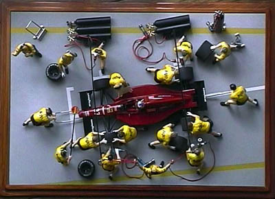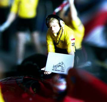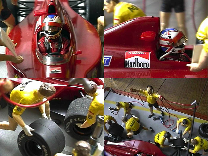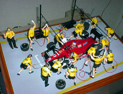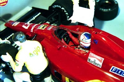 しかし今になって見直してみると全くもって未熟な出来である。まず、赤の塗装が下手だ。赤とか黄色とかは隠蔽力が弱いので、下地をしっかり明るい色で作っておかなければいい発色が得られないのだ。あの頃はそれやってない。だから赤がくすんでいるのだ。あとジオラマというのを忘れたわけではないのだが、マシンを汚すのをためらってしまった。小心者の俺としては、せっかくぎらぎらに塗装したものを汚すことが出来なかった。F1マシンの走行後なんて真っ黒なのだ。それをも上手く再現しなくてはマイスターへの道は遠いのだ。ああ、まだ未熟な俺ぇ〜