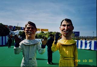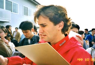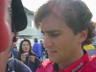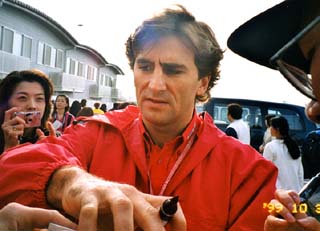 次に来たのは、おお、ザナルディーだ。91年にF1デビューしたのだが泣かずとばずで、心機一転アメリカのカートに行って連続チャンプをとった、まさにアメリカン・ドリームをなしえたイタリア人。99年にF1カムバックしてちょっと落ち目のウイリアムズで散々な年を送っている彼。しかし、彼の”ファンに対する真摯な接し方”には感激の極みだった。誰にでも親切にサインをしている。求められれば誰にでもしてくれるって感じ。当然俺もサインをねだってみたかった。しかしサインペンも色紙もない。サインをねだっている人は、色紙を持っていたり、プログラムブックを持っている。このプログラムブックは2000円もするのだ。俺も「何かないか?」とバッグをごそごそと探して、出てきたのはメーカーさんにもらった手帳に付いていたぺらぺらのメモ帳。だめもとで、有名人のインタビューにマイクを差し出すあつかましいワイドショーのレポーターのごとく、そのメモ帳をこん身の力を絞って差し出し続けた。「われながら見劣りするメモ帳だなぁ」と内心恥ずかしかったが、頑張った。もうそろそろザナルディーもゲートをくぐると言う頃に、