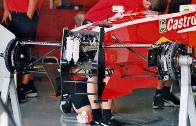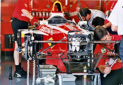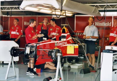 続いてウイリアムズ。栄枯盛衰とはこのこと?91年くらいから飛ぶ鳥を落とす勢いで勝ちつづけてきたチームも、”空力の天才”エイドリアン・ニューエィー(デザイナー)がマクラーレンに逃げられてからというもの、凋落の一途をたどっているのね。それでもまだふんばっているのはすばらしいねぇ。ここの作業風景だ。