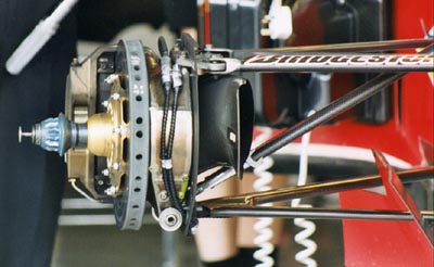 他のチームと違ってフロント部全開だね。ウイリアムズも(リ)アクティブ・サスペンションでアドバンテージを得ていた92年頃は、その部分を布で隠しまくっていたっけ。今思えば、その頃から"隠し”が一般的になってきたっぽいなぁ。そうかウイリアムズが元凶なんだな。車載カメラはロールバートップに加えて、ロールバー左側面にも見えるぞ。フロントサスペンションのロアアームを貫通しているディフレクターはこんなに薄いのだ。プラモデルではこういう部品は一般的に強度を稼ぐために厚くなっているのだ。だから我々は”薄々攻撃”と称して、カッターの刃をエッジにあてて、”キーキー”という音とともに削り込むわけだ。いわばカンナを斜めに当てるみたいなもんだ。こうすることで出来上がりの模型は素組みのときとは比べ物にならないくらいシャープになるのだよ、はっはっは。