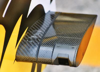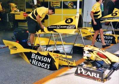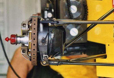 リア部だ。ホンダのスキルが注入されているという公然の秘密の無限エンジンが見える。白く見えるパイプはエグゾーストパイプだ。昔は各シリンダー排気管から集合させた直後にアンダーパネル下に排気して、これをマシン下部に流れる空気の流速を高めダウンフォースを得るのに利用していた。最近はアンダーボディーの形状がいろいろと制限されたためか、エンジンの回転数(=排気パワー)でダウンフォースの量が変わらないようにしるためか、排気も下に出さないのが多いね。しかしこのエグゾーストパイプ、サスペンションを避けてクニャクニャ曲がっちゃって、取り回しが大変そうね。