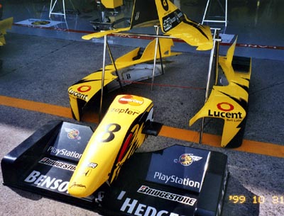 こっちは同じくフィレンツェンのフロントノーズ。ノーズカメラがついている。”PlayStation”がありまっせ。隠しもはいってまっせ。カウルの内側にはカーナンバーが記されてまっせ。ウイングは分かるけど、カウルも共用パーツではないみたいね。赤いマルはブリヂストンの”ドーナツ”だとずーっと思っていたのだが、Lucent Technologyっていう情報通信会社だったのね。
