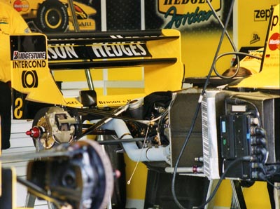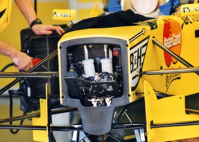 ほかのチームと少し違うモノコック前端。隠してないからよく分かるね。他チームのマシンは、フロントサスの前側取り付け位置と同一面にモノコック前端が位置しているのだけど、ジョーダンのマシンはそれ以上にモノコックが伸びているぞ。よく見ると、ロアアーム前側取り付け位置確保のためにここまでモノコックを伸ばしたみたいね。サスペンションジオメトリーは難しいものがあるからなぁ。モノコックに対してロアアーム取付け位置はだいぶ低いみたいだ。