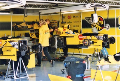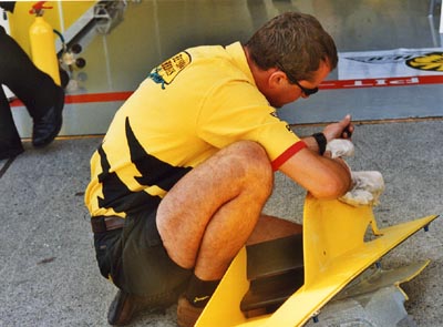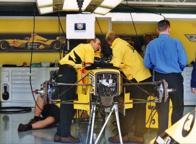 次なるチームはジョーダン。観戦はジョーダンのピットガレージだったので、真上から超接近遭遇でマシンの観察ができたぞ。上り調子のチームは元気があってよろしい。ジョーダンのカラーリングは数年前から爬虫類&昆虫シリーズに入っている。このデザインはホーネット、いわゆるスズメバチね。10年くらい前に国会議員を”蜂の一突き”した某女性はジョーダンのスタッフにぴったり?