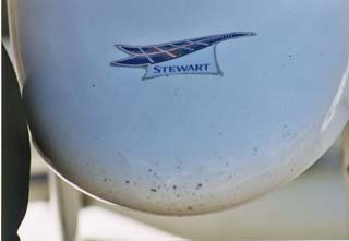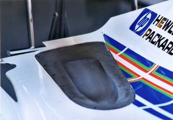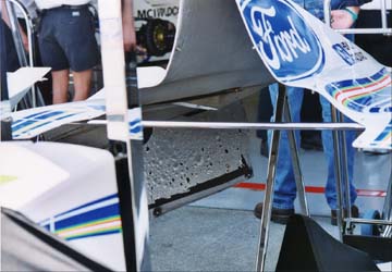 上方排気といって、エンジンの排気をカウル上側に出すのが流行っている。排気管の長さが短くできるとか、エンジンの高回転化を排気管の共振周波数を高くすることでマッチングできるとか、ギアボックスまわりの空力が洗練されるとか、排気(エンジン回転数)によるダウンフォースの影響を受けないようにできるとか、利点は結構あるらしい。フェラーリが始めたこのシステムをいち早くコピーしたのがスチュワートだ。こんな具合だ。