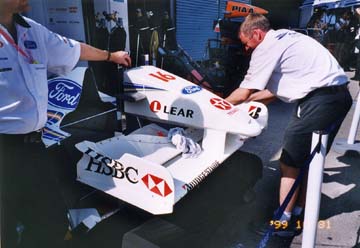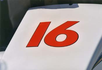 また目の前のノーズやゼッケンをアップで撮るとこんな具合。ちょっといいでしょ。ちなみにノーズの先端にはチームの名称を入れる決まりになってる。セナ全盛時代のマクラーレンはもちろん”McLAREN”、すぐ近くに”少年ジャンプ”なんてステッカーがあった。10cm幅くらいの超小さなものだったが、当時1億円くらいのスポンサーフィーだったらしい。