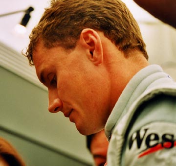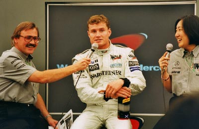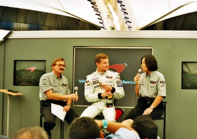 Sさんの面白い話を聞いていると、パドックにマクラーレンのドライバー“デビッド・クルザード”がやって来るとの案内があった。マクラーレンのスタッフ(外人)と通訳のおばさん(日本人:お姉さんだったのかも?)が正面ステージ?に構えて、ドライバーが来る前に練習をしようといっている。公開放送のADみたいなもんだ。