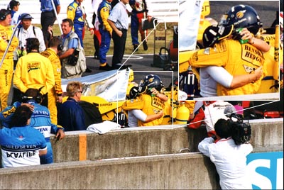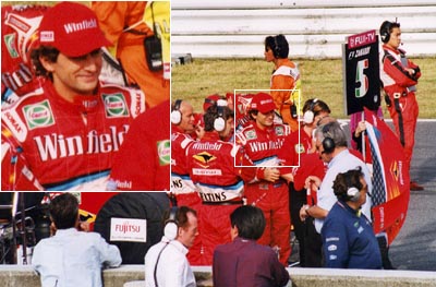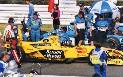 このグランプリを最後にF1を去るデイモン・ヒルがグリッドに向かう。リアタイヤ付近から振り向いているBARのメカニックに注目。左がラッキーストライクカラー、右が555カラー、まるで人造人間キカイダーのようなスーツでしょ。