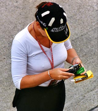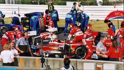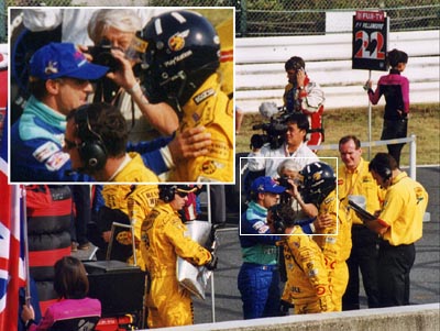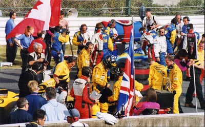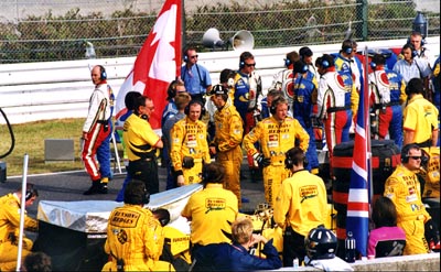 グリッドについてすぐさま車から降りる。左前方にはBARのジャック・ビルヌーブだ。カナダ国旗が新鮮だ。しかしやっぱりキカイダーだよね。