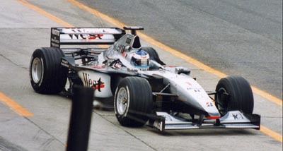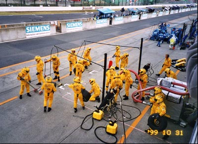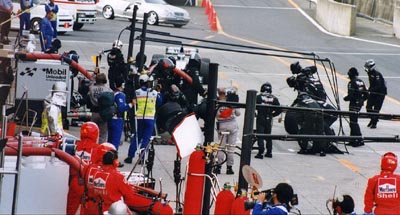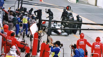 続くピットインはトップ爆走中のハッキネンだ。黒服軍団が出迎える。しかしマクラーレンの真っ黒スーツはダースベーダーを想像させるなぁ。