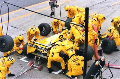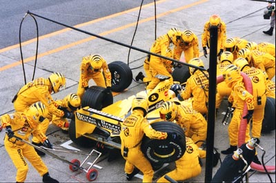 つづくピットインはジョーダンのデーモン・ヒルだ。なにやらどこかでスピンしたらしい。