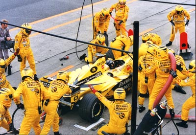 フロントウイングの交換に集まっているメカニックは、なにやら花に群がる蜂のようだなぁ。また、給油ノズルは着弾寸前。左フロントタイヤマンはタイヤ交換よりフロントウイング交換を優先しとるなぁ。