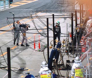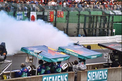 ボーンとエンジンブロー。すごい白煙じゃ。生ブローは迫力満点だ。どうでもいいけど、ザウバーのシンプルな作戦本部がノスタルジックだ。