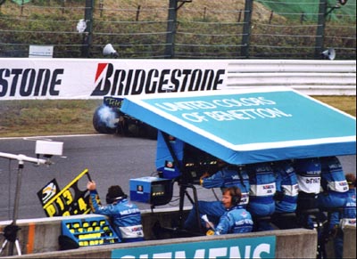 (「グフッ、4時かぁ。レース後にもいろいろと面白そうなことがありそうなんだよなぁ」)と、諸々のイベントが脳裏を横切った。表彰台でのシャンパンファイトするドライバーは、すなわち99年のワールドチャンピオンになるわけだ。見てみたい!また西コースがオープンされるので、レース直後の生々しいゴムの臭いやタイヤかすバリバリのところを歩いてみたい。それに最大の関心事である99年シーズンがすべて終了したことによる、各チームの放出品ゲットである。そのために大枚持ってきたのだから・・・しかし楽に帰ることができるのも魅力である。