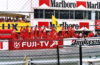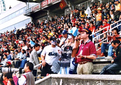 ハッキネンの表彰台、松井のお立ち台、クイーンの武道館などと同じように、そこが自分の家のようになじんでいる俺にとってのピットボックスから出て、緊急レスキューしてくれたトイレの前を横切り、ゲートを越え、朝のわくわくとした気持ちで通ったホームストレート下のトンネルから出て、グランドスタンドの下(観戦中の人に注目される場所だ)に来たとき、大歓声とともにハッキネンがチェッカーフラッグを受けていた。デイブ・リー・ロス風のハッキネンの私設応援団長も心に来るものがあっただろう。