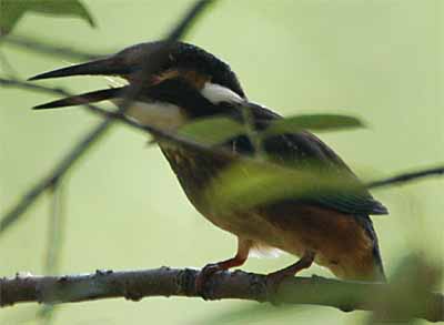 さて前週に見つけた第3のポイントに行くかどうか? 悩みましたがやはり”未知のポイント探し”の誘惑には勝てず、新ポイントを探索に出かけました。そして何気に見つけたポイントは、そう、カワセミの楽園と名づけてもよいくらいのところです。飛ぶ飛ぶ、とまるとまる、ちゃっぱんちゃっぽんする、食べる食べる。もう筆舌に尽くしがたい時間を過ごしました。地盤の悪いところに三脚をセットしまず押さえの数枚を撮った後、RAWに挑戦です。ニコンの一眼デジはJPEG撮影の評判は芳しくないのですが、逆にRAWは大絶賛されています。あっ、RAWって言うのはCCDからの出力をそのまま記録するモードです。ファイルサイズは10MBと大きくなりますが、PC上の”現像処理”と呼ばれる画像作成で自分の完成でいかようにも出来ちゃうんです。まさに現像処理です。・・・そのRAWで撮り始めたのですが、なんだか大変なことになっちゃいました。数枚撮るとシャッターが切れなくなります。もう壊れちゃうんです。っていうか書き込みに数分かかっちゃうくらいなんですね。こんなの使えない、カワセミの捕食のいいシーンを逃してしまいました。しかし自宅に帰ってよくよく考えたら、RAWには本当のRAWと圧縮RAWの2種類があるんです。設定は・・・ああやっぱり圧縮RAWでした。これは全く使えませんよ、ニコンちゃん。