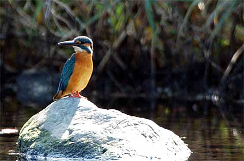 さて先週土曜日は経営フォーラムで疲れきっていた体ですが、日曜カワセミちゃんとの出会いを思うとおのずと元気が出てきて、5時起きなんてことが平気で出来ちゃったりします。やはり仕事以外の趣味が人間を元気にされるのですな。そしてすっかり日の出も遅くなった秋の日曜、釣り人もいなくなり閑散としたカワセミポイントDへ出撃です。しかし雲ひとつないいい天気で心もうきうき、前週の着いたとたんに雨!っていうのとは大違いでした。しか〜し到着後ちょっとだけ顔を見せてくれたあと、ぜんぜん出てきてくれません。1時間半粘ったのですが、根気もなくなりすたこら退散です。しかしそのまま帰るのも悔しいので、先日息子と探検して見つけたカワセミポイントEへ行ってみることにしました。10分ほどゴロゴロとした石の上を歩くのは大変ですが、まあ運動と思えばなんともありません。さて着いたポイントEは、川から水が流れ込んで、それが相模川に流れ込む30m×10mくらいのバッファー池というかたちになっています。しかし着いた早々、池の対岸に一羽発見。ちょっと手前のごみが邪魔です。川って異様にごみが多いんですよね。全く! またこの池にはいかにも”留まってくださいまし”っていう木が池の中に朽ちているのですが、そこにはぜんぜん留まってくれません。絵になるんだけどなぁ。そんなこんなで張っていたらなんと、目の前4mの石の上に留まってくれちゃったりするではありませんか。これには心拍数280!そおっと、レンズを向けたのですが、なぜが飛んでっちゃいました。1枚くらい撮らせてくれたっていいのになぁ・・・と非常に悔やまれたEポイントでした。