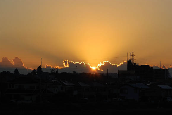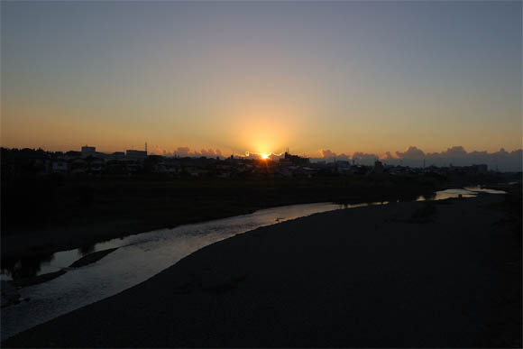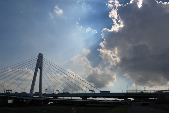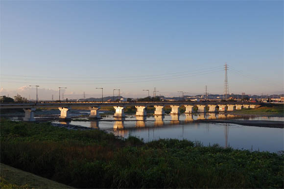 最近の多摩川サイクリング基点となるのは「多摩大橋」である。下調べしておいた河川敷に車を停めると東の空に低くかかる「モクモク雲」の稜線が黄金のように光っているのが見えた。もうすぐ日の出だ。日が出る前にこれを撮っておかねば!と、急いでドッペルを取り出し15秒で組み上げ、橋に急いだが、寸でのところで太陽が顔をのぞかせてしまった。惜しかった!