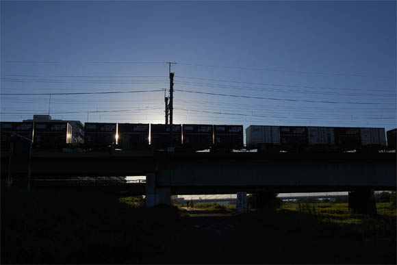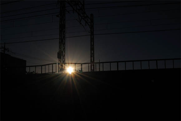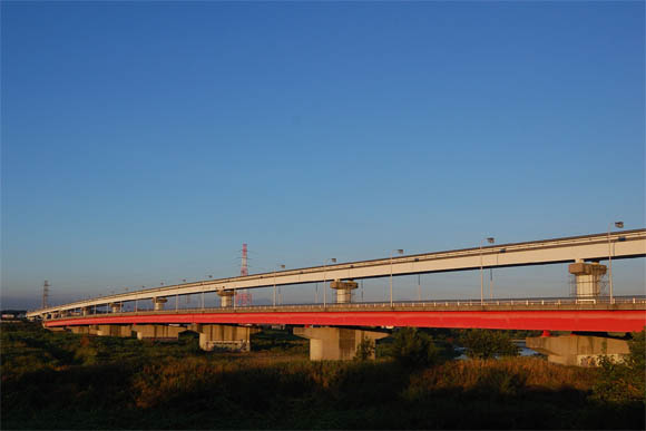 次の橋はモノレールと立日橋(立川と日野をつなぐという、分かりやすいけど味のない名前だなぁ)だ。モノレールを見るたび、終電がなくなってモノレール下を歩いて帰ってきたこと思い出すなぁ。ちなみに振り返って撮影したので朝日がいい色である。