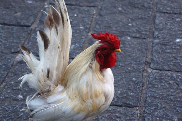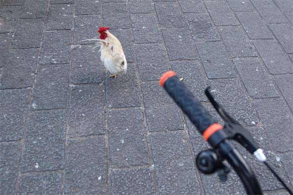 日野橋を過ぎるとサイクリングロードがなくなる。なくなるのだが、ちょっと外回りすればよい。そのロードがなくなるあたりに「いつも」いるのがこのニワトリだ。いつ行ってもいる。たぶん餌付けされているのだろう。猫がいるのはよくあるが、ニワトリってのはなかなかないねぇ。