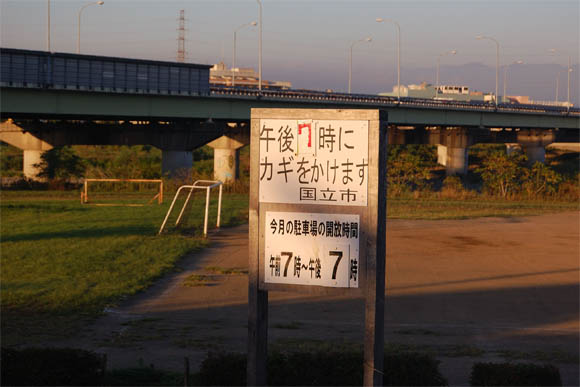 しばし砂利道を走って、中央高速橋たもとの国立河川公園にでる。朝早く行動したいのだから、4時ごろからあけて欲しいところだけど、まあ無理なのかなぁ? 7時と書いてあるけど、前回行ったときは6時前には開いていたようである。