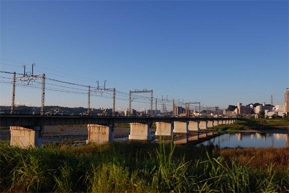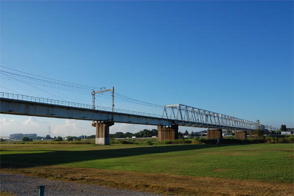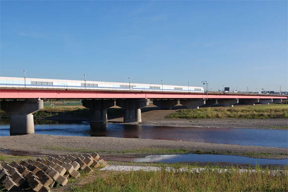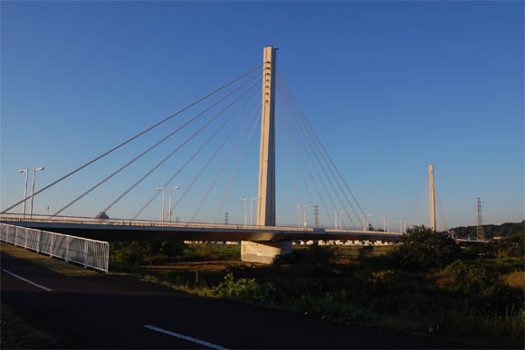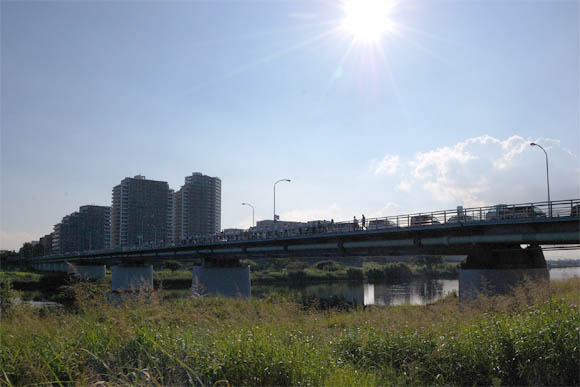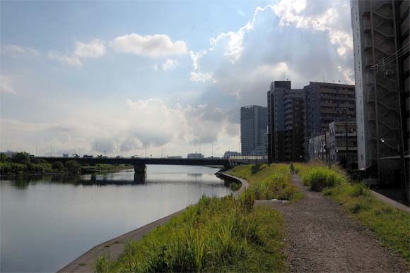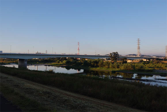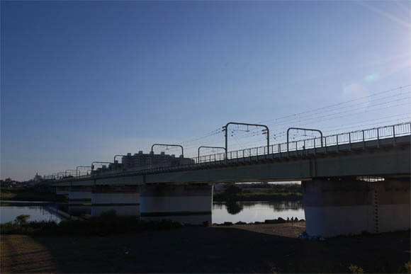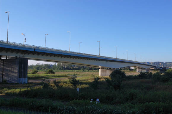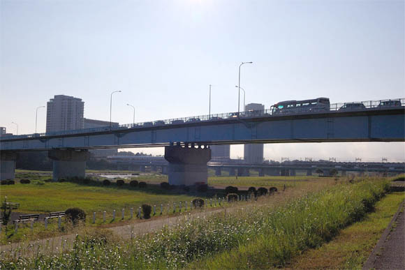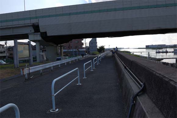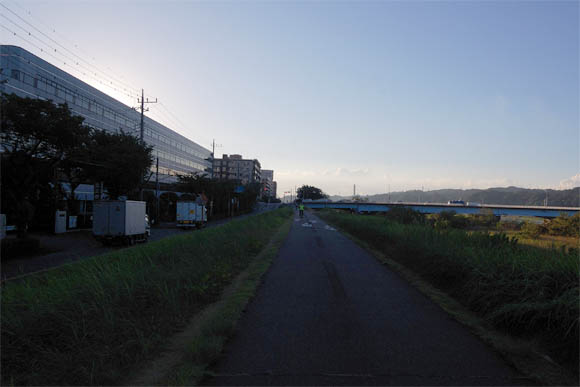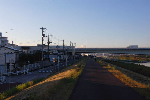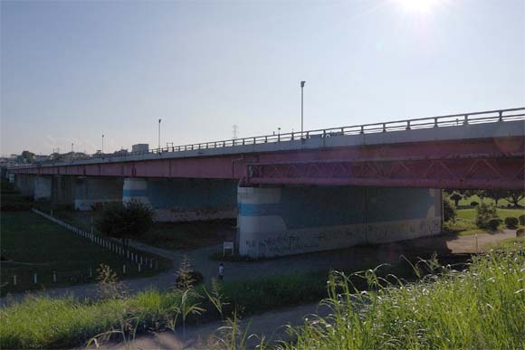 土手のロード自体は狭いが人も少ないし走るのは苦ではない。しかし川の方を見ると、左側のがうらやましく見えた。朝は左側が建物の日陰モードになる場所が多いので涼しそうだからである。時間は6時半過ぎ、太陽は既に元気いっぱいである。そして東名の下をくぐった(後ろ向き撮影)。