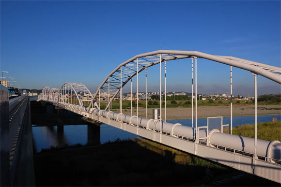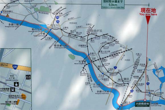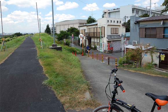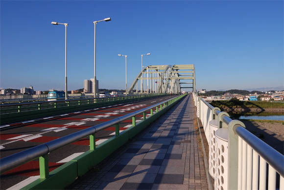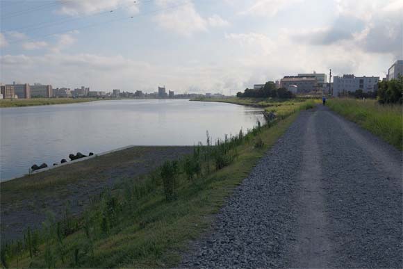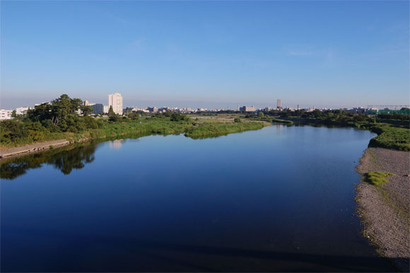 さて一区切りの世田谷街道・多摩水道橋だ。時間は6時35分。まだぎりぎり「爽やかさ」が残っている。しかし写真を見て分かる通り空はピーカンであり、これからが体に厳しい時間なのだ。ここまで寄り道したり、ちんたら走ったりしながらで1時間半弱であった。江ノ島サイクリングは境川沿いを40kmで2時間だからだいぶゆっくりしたペースである。でもこれくらいが良いのである。そしてここからは河口に向かって川の右側走行となる。