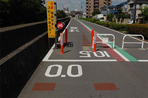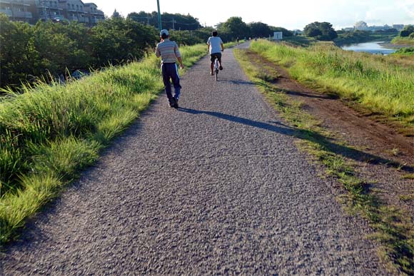 帰りは大師橋を渡らずに、川の北東側(上流に向かって右側)を行くことにしよう。やっぱり景色がずいぶんと違う。そしてオフィシャルサイクリングロードの始まりだ。