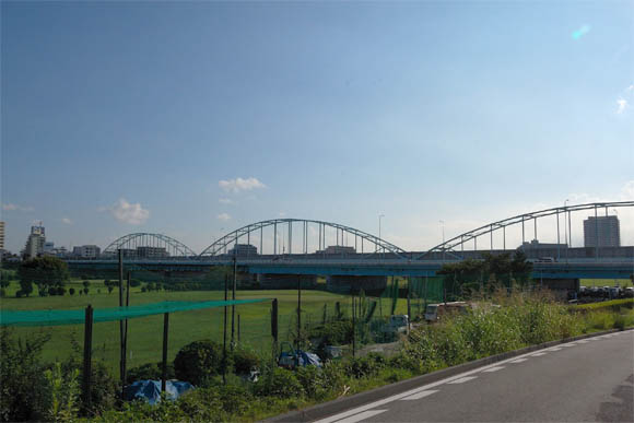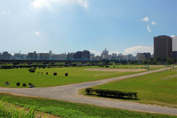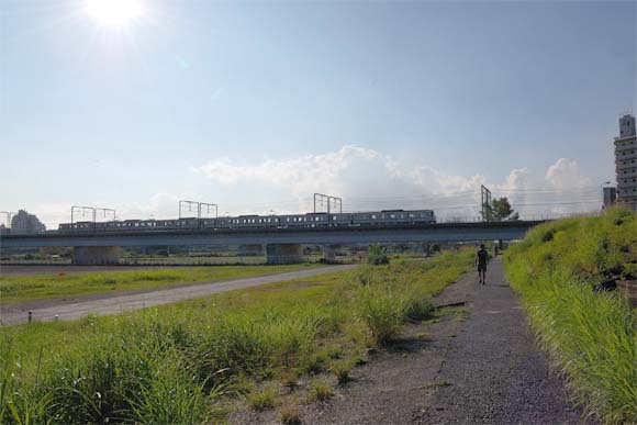 こちらサイドのサイクリングロードは広いし快適なのだが、じりじりと高度を上げてきた殺人的太陽光はまったく快適ではない。500mlのペットボトルは行きにはほとんど飲まなかったが、帰りは既に1本終了。そして残りの凍らせて持ってきたものも溶けて冷え冷えの部分は飲み干してしまった。氷は結構溶けないのである。さらにサイクリングロードは思いのほか自販機がない。砂漠で遭難したような気持ちで、ペダルをこぐのだった。京浜東北から見える多摩川東京川の河川グランド。緑がきれいだ。