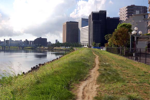 さて日の出直後は超快適である。暑くなく寒くなく空気が「凛」としているし、人もまだ少ない。困ることといえば、南東に向かっているのでまぶしいことくらいだ。まずは下流に向かって左側を走る。右側は一部サイクリングロードがなくなっていたり、車道を走らなくてはいけなかったりするところが多いからだ。