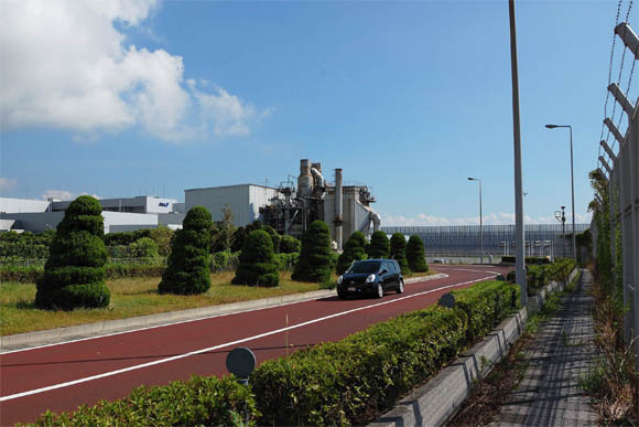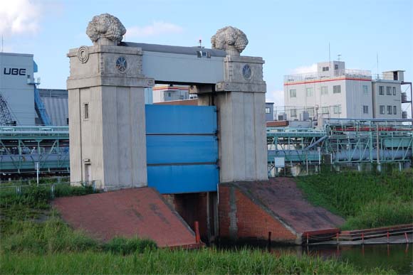 多摩川にはいたるところにゲートがある。ここのゲートは上に彫り物があったりして何やら文化遺産的である。このあたりから道は舗装になる。そして味の素の工場が延々と続いていた。大きいのね。
