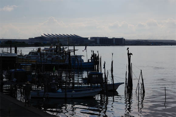 河口は釣りボート屋がたくさんある。奥に見えるのが羽田空港。