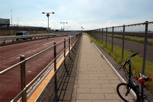 あとはいけるところまで湾岸線の海側を走る。歩道がどこまであるのか? また滑走路の下(トンネル)をくぐり、ドンドン行こうを思った。ら、トンネルを過ぎた過ぎのトンネルには遊歩道がなくなっていた。ああ、ここまでか。なんかあっさり終わってしまったなぁ。