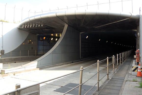 と思ったのだが、横を見ると階段がある。とっぺる号は軽いので階段で抱えるのも苦にならない。階段の上は工事中だった。後ろを見ると今さっきのトンネルだ。