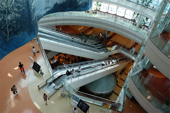 しかしだからといって出発ロビーにいてもしょうがないので、5Fの展望デッキを目指した。目指したんだけど、一気にいけるわけではなくて、あっちこっちを乗りついていかなければならないのは、ちょっとした商魂を感じてしまう。「ただで展望させませんよ、あっちこっち回って買い物欲をだしてね〜」って。