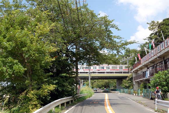 でもやっぱり川沿いを走りたいので左を見ながらいくと、京急をくぐったところで小道があった。そく行く。するとやっぱりそこが川へのアクセスの道であった。後ろを向くと橋の下をくぐれないのが分かる(もしかしたらくぐれる?)。
